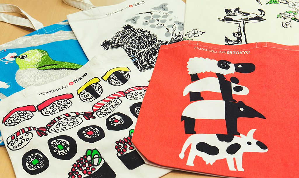 ショルダートートにプリントされたイラストは、「才能に障害はない」を合言葉に、障害者への所得支援を続けてきた、社会福祉法人東京コロニーの事業である「アートビリティ」に登録されたアーティスト作品 5,000点もの中から選ばれた5点。世界的な賞を数多く受賞しているデザイナーの福島治氏がデザインしています。
